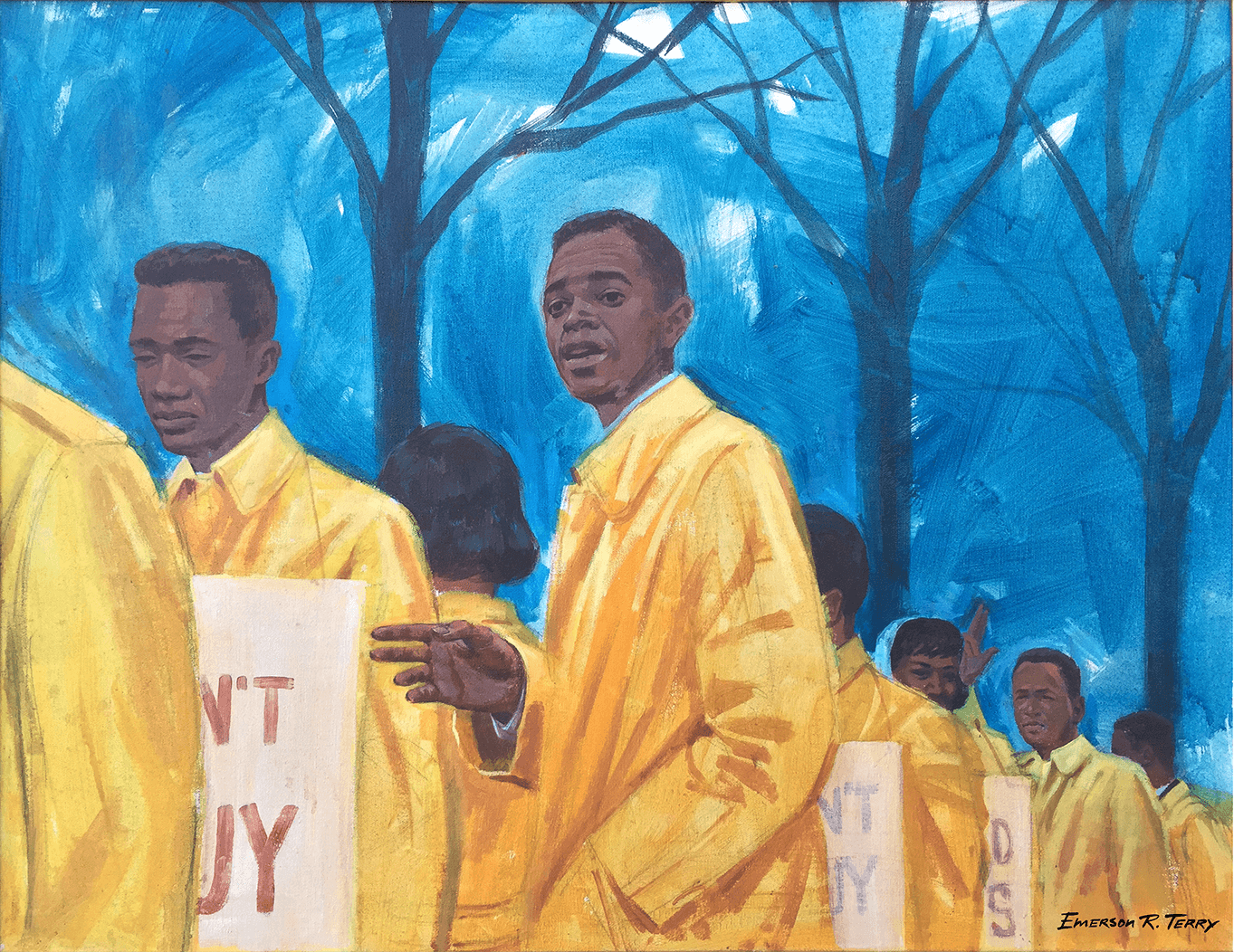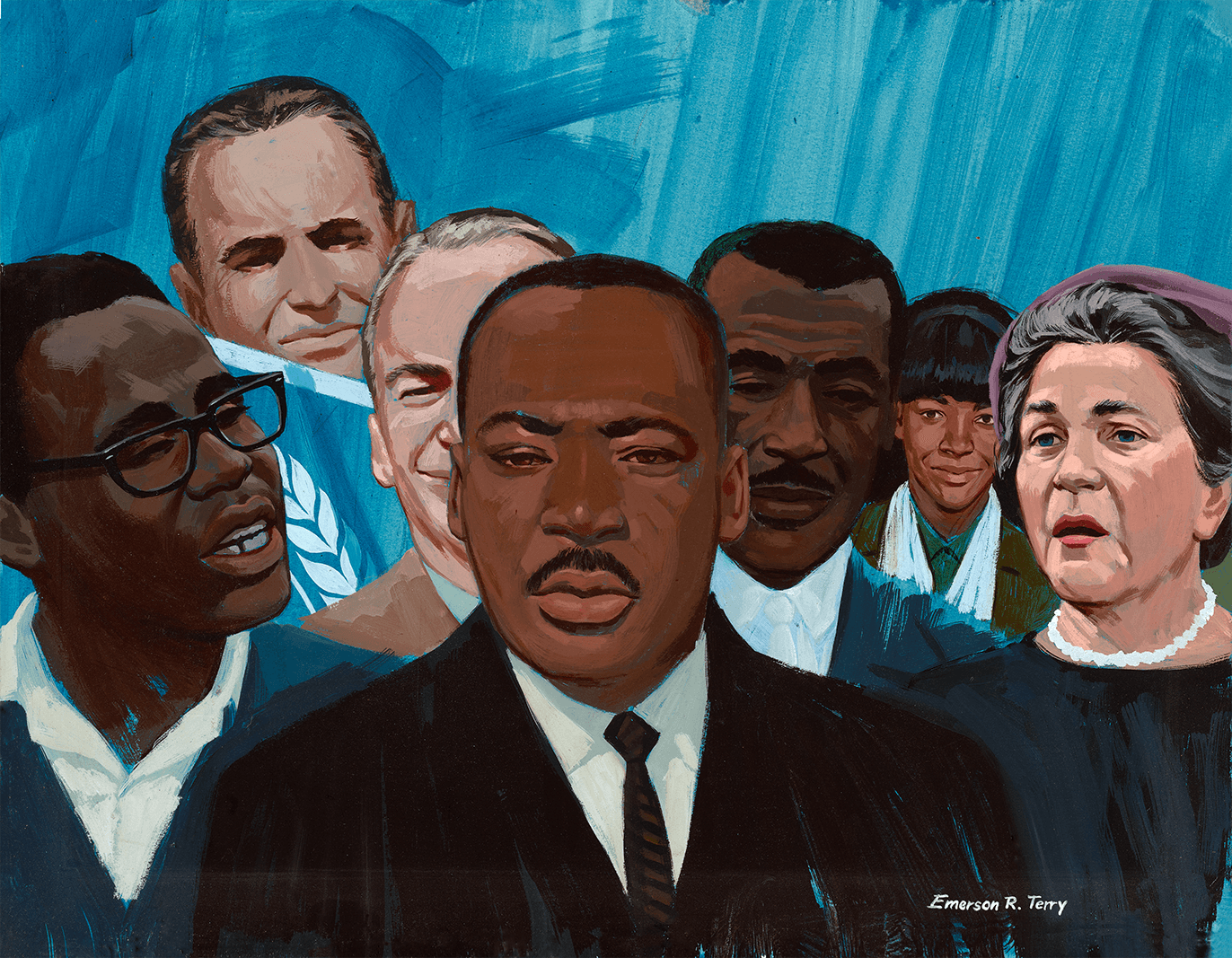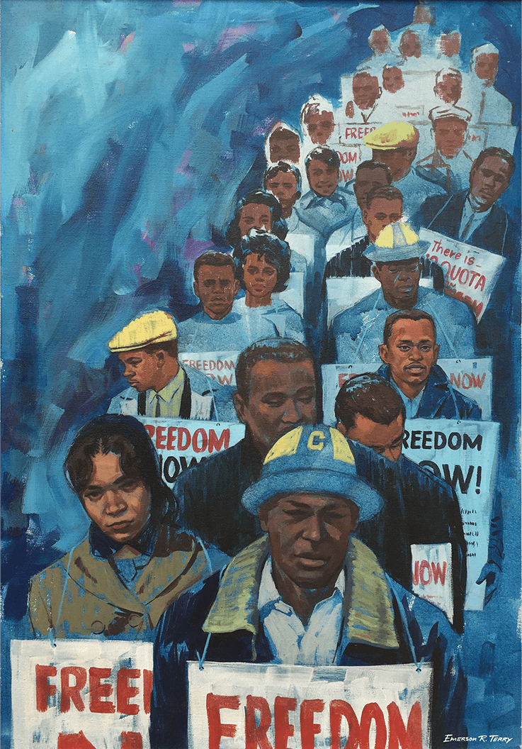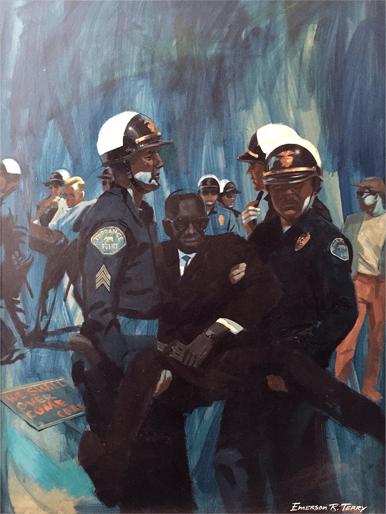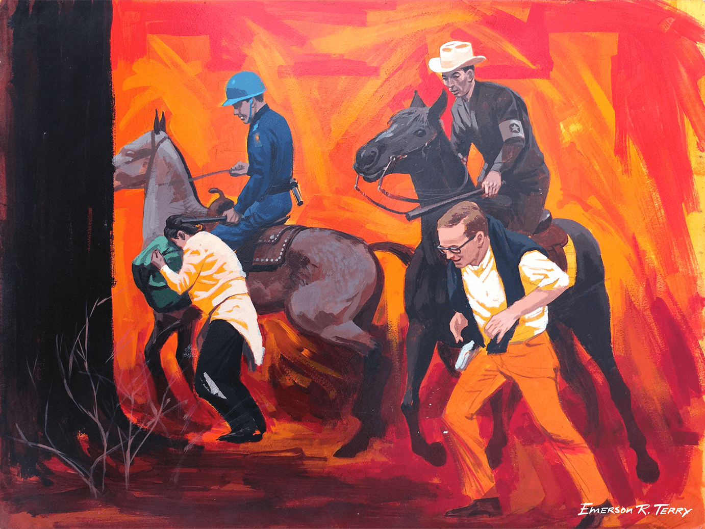 Birmingham, GA, Policeman with his knee on a woman in her Sunday go to Church clothes on the ground with a big Coca Cola sign in the background this is “Non Violence in a Violent Society.”